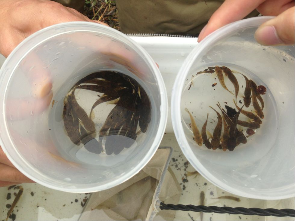 まず、沢山いるこやつらの種類を分けていきます。今回はクロヨシノボリとオオヨシノボリの二種が確認出来き、それぞれカップに分別したのがこちら