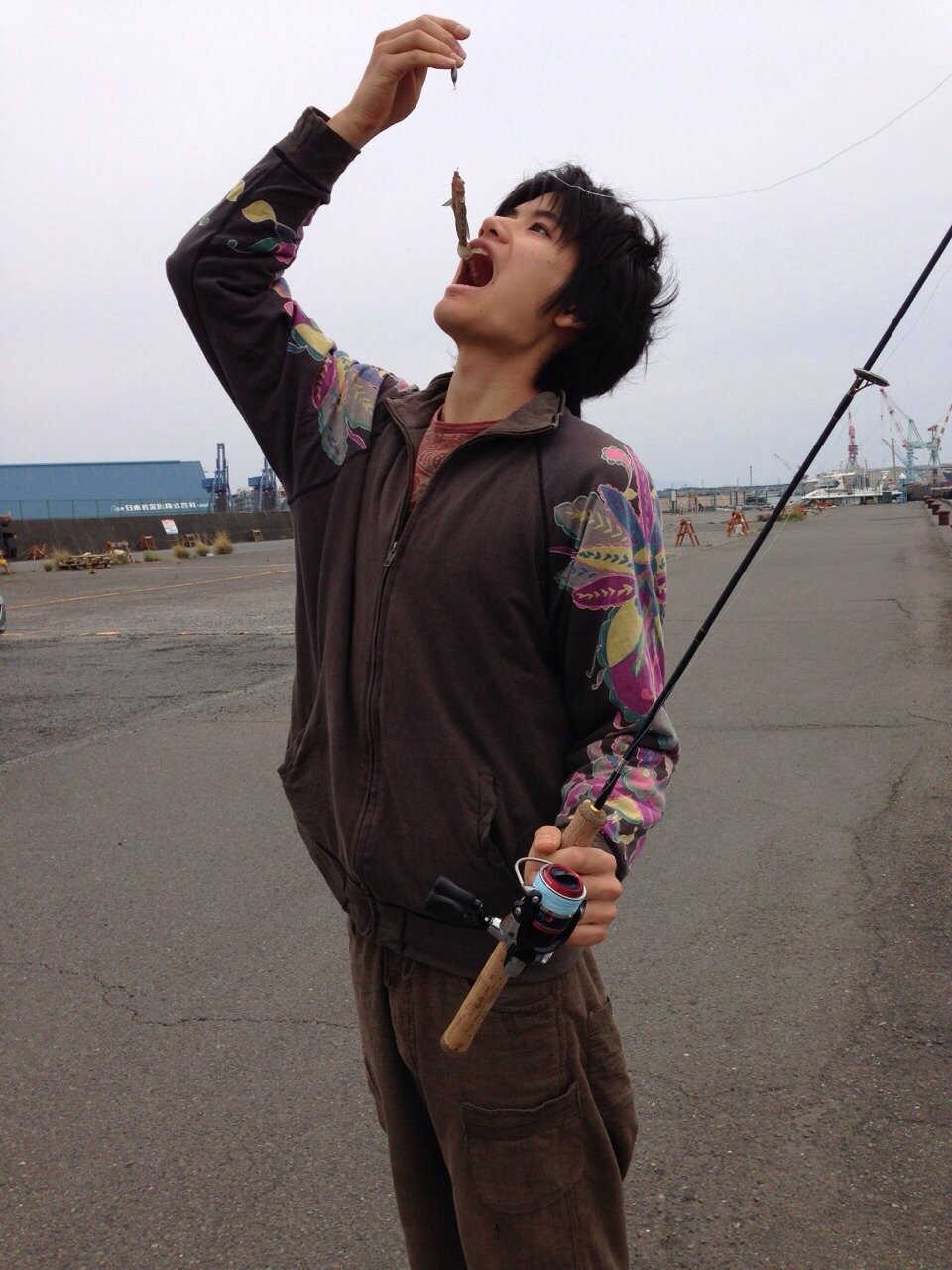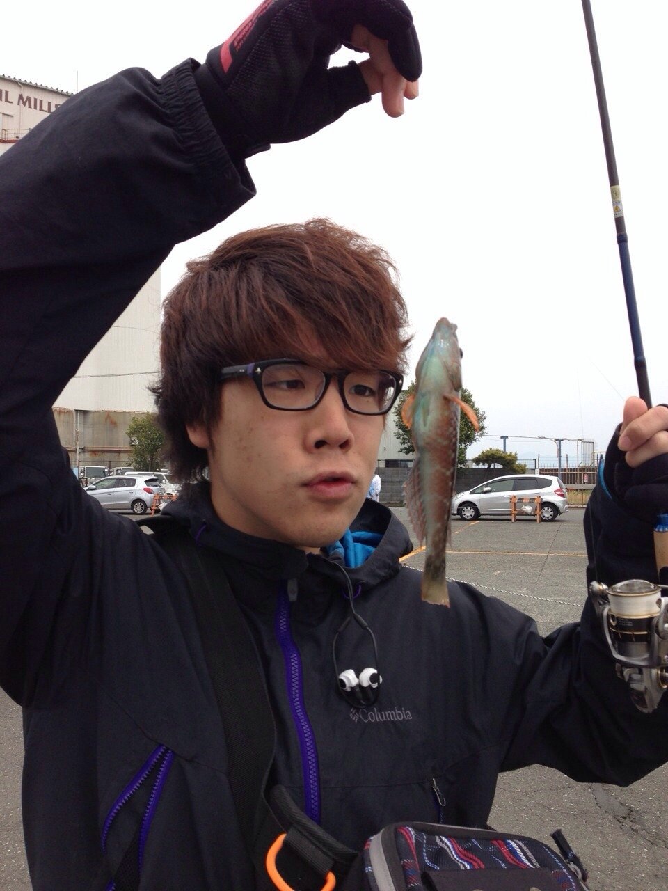 こちらは見づらいですがササノハベラを釣り上げた部員。なんとも言えない表情です…