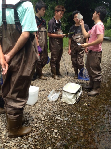 こちらは実際に水に立ち入り、生物の調査をいままさにしようとしているところ。