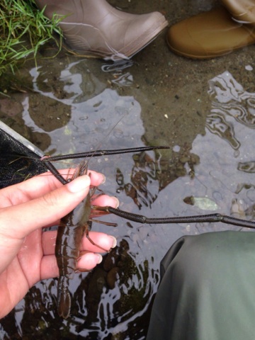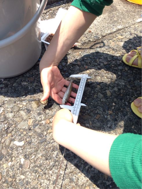 そして集めた魚たちの計測を、私はノギスで魚を測っていましたが足が痺れてしまったので、一年生に途中でバトンタッチしました。川エビの暴れん坊将軍ことテナガエビの暴れ狂う手に苦戦…