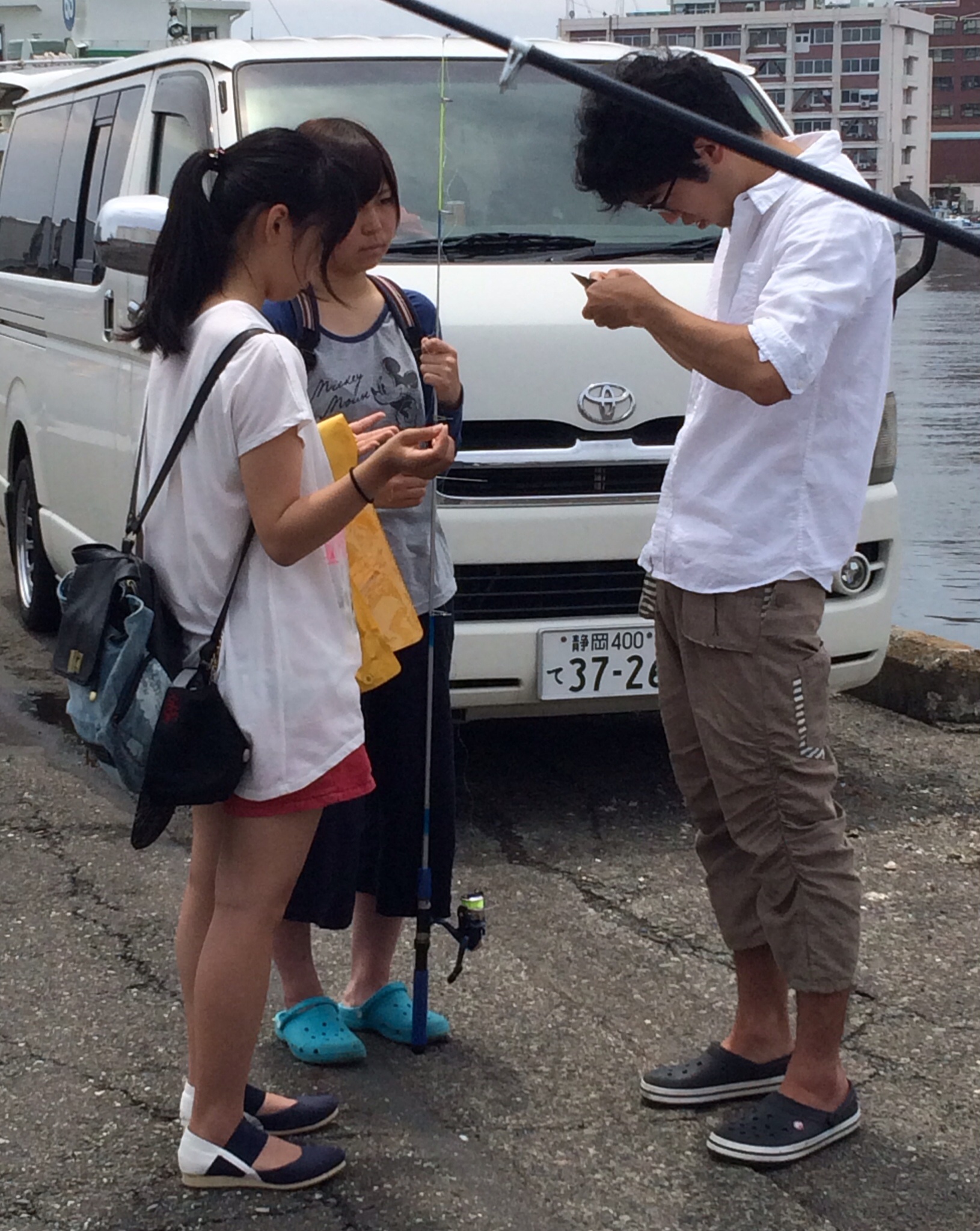 買ったばかりの釣り竿を先輩に教わりながらセッティングします。