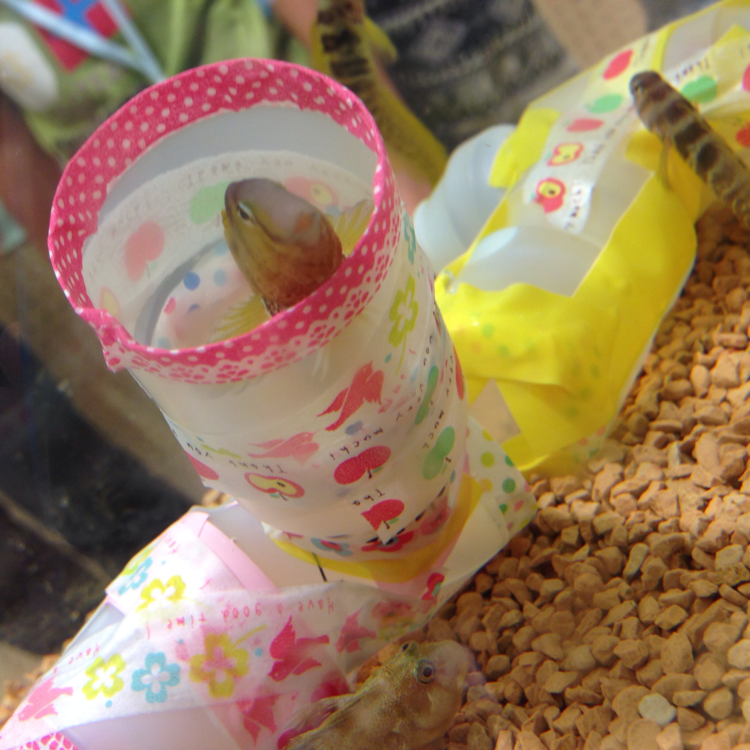 ③お魚のお家作成 生物説明プレートの隣で水槽に沈めるお魚のお家を作成してもらいました! 空きヤクルト容器にテープを貼り、ビー玉を入れ可愛いお家が完成です(^_^)
