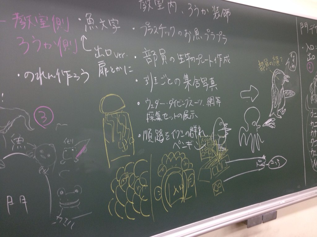 教室の装飾、水槽説明の模造紙作り、展示生物のプレート作りを主に行う班こそ私たち装飾班です!!
