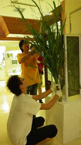 写真は、カヤキリの餌を交換している所です。