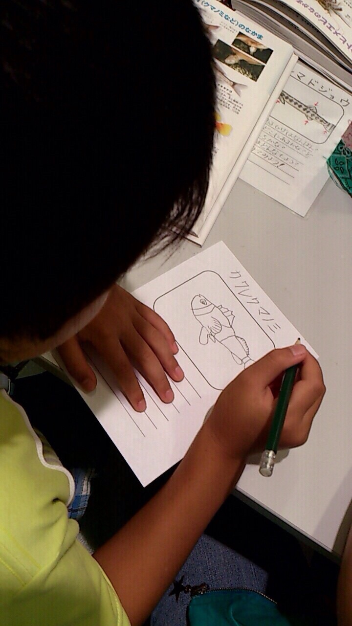 ②生物説明プレートの作成 作業場にある机を囲んで生物についての説明プレートを子供飼育員さんに作ってもらいます!実際に生物を観察し絵を描き、簡単な特徴を文にしてもらいした!