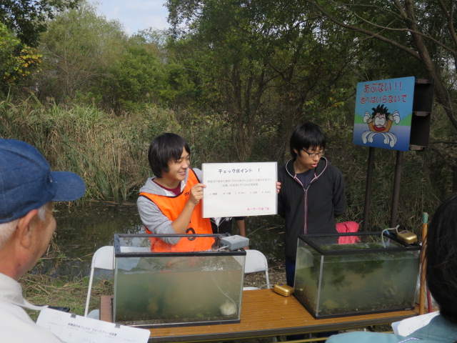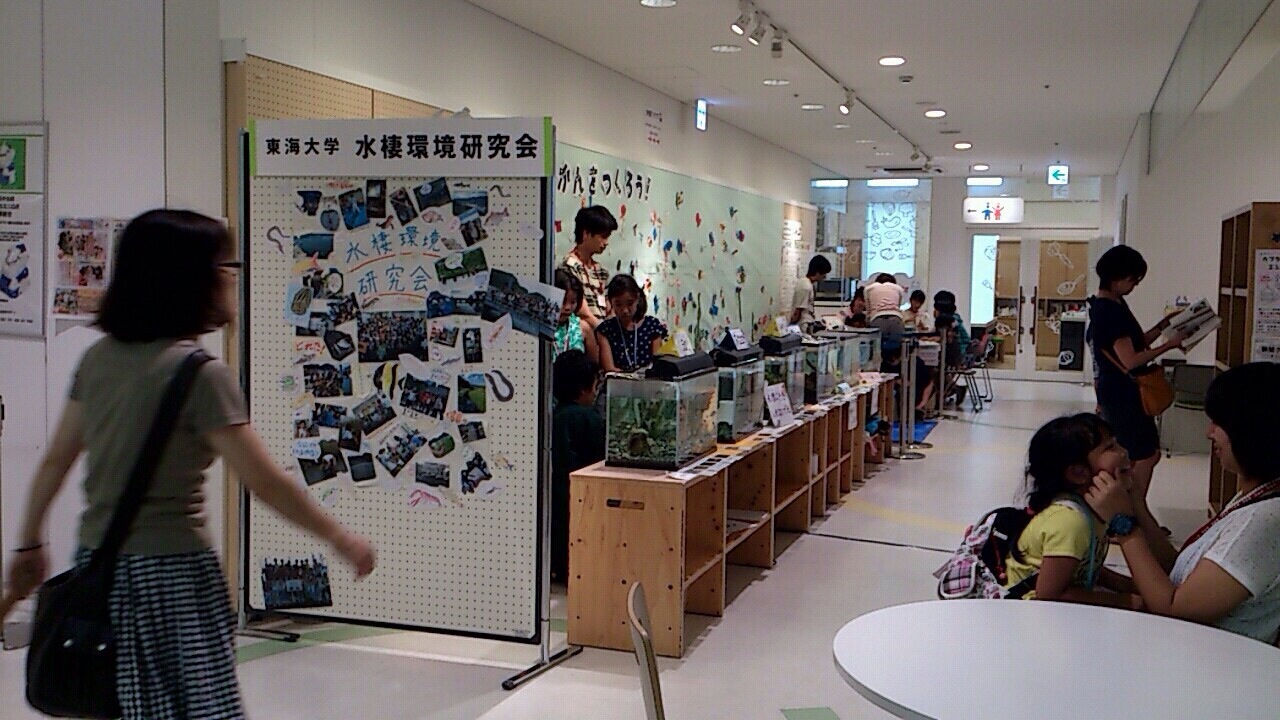 私たち水棲研の活動の内容は、麻機遊水地に生息するいきものの水槽展示、というものでした。他のブースでは、カヌー体験や釣り体験、小動物とのふれあいなどができたそうです!!