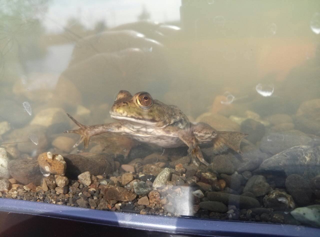 水棲研はカメ捕獲と同時進行で麻機に住むヌマガエルやメダカ、ヒメミズカマキリなどを捕獲し、参加者の方々に紹介しました。