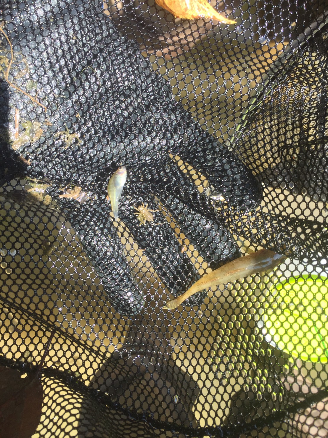 モツゴが多く採集できました。魚も直射日光が苦手なのか水草の根元や橋げたの下などに多くいました。
