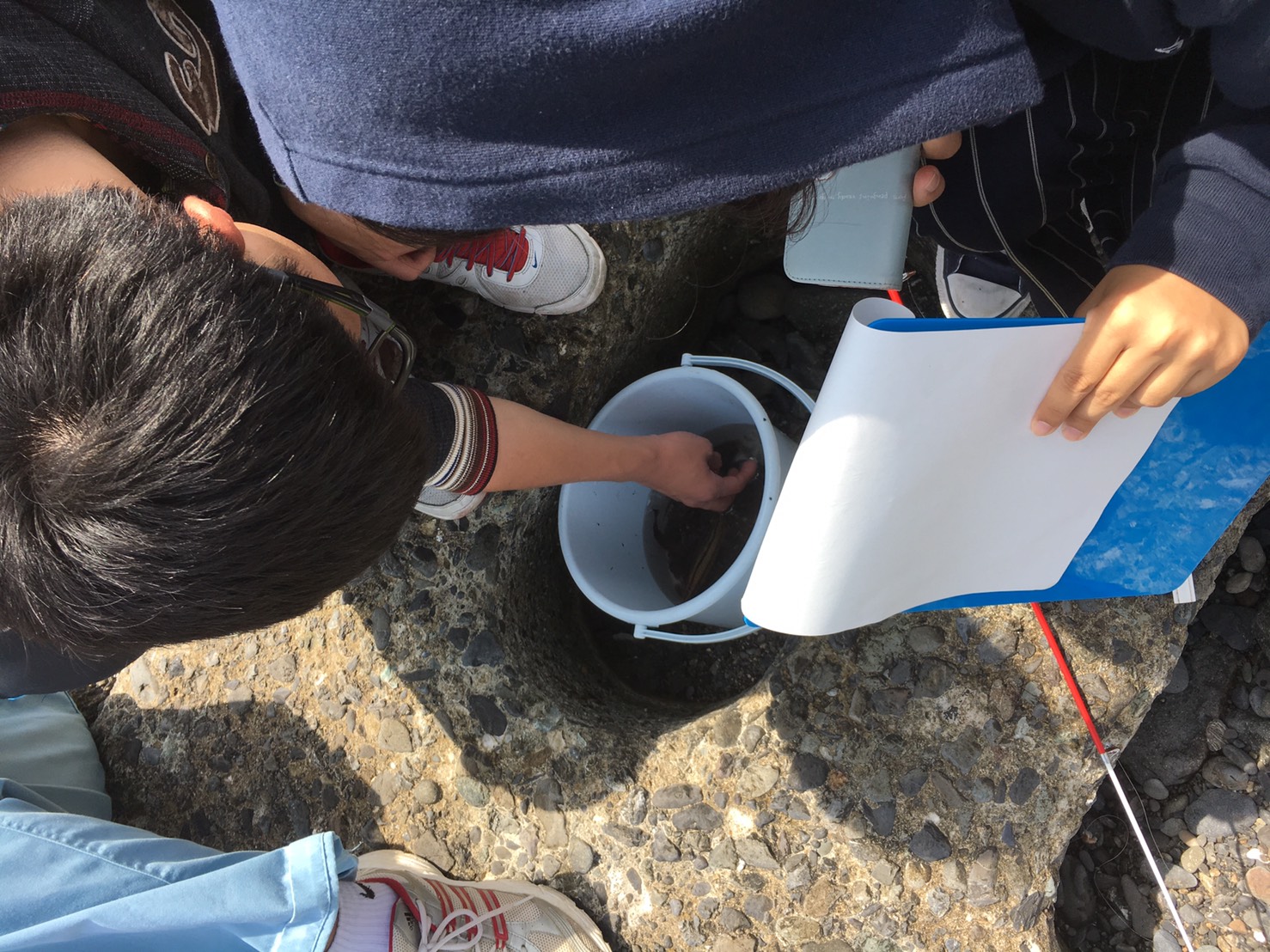 初めに、一年生に水温やpH、CODなどの計測の仕方を説明して実際にやってもらいました。